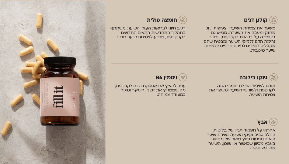 פורמולה ייחודית ברמת פרימיום – עם רכיבי פטנט, מינונים גבוהים ואיכות בלתי מתפשרת. פותחה במיוחד לסיוע בעצירת נשירה, חיזוק השיער ועידוד צמיחה מחודשת.