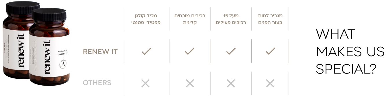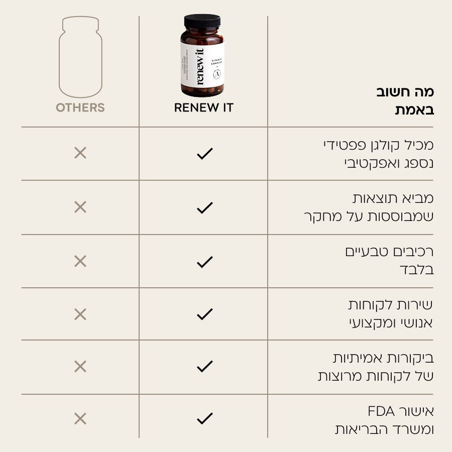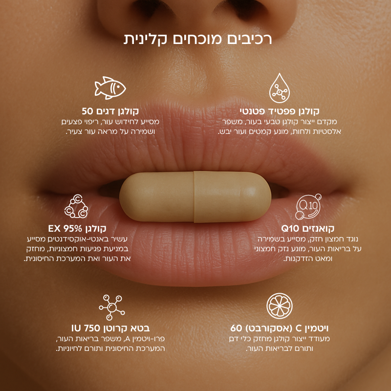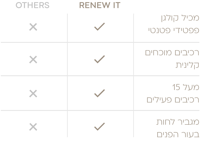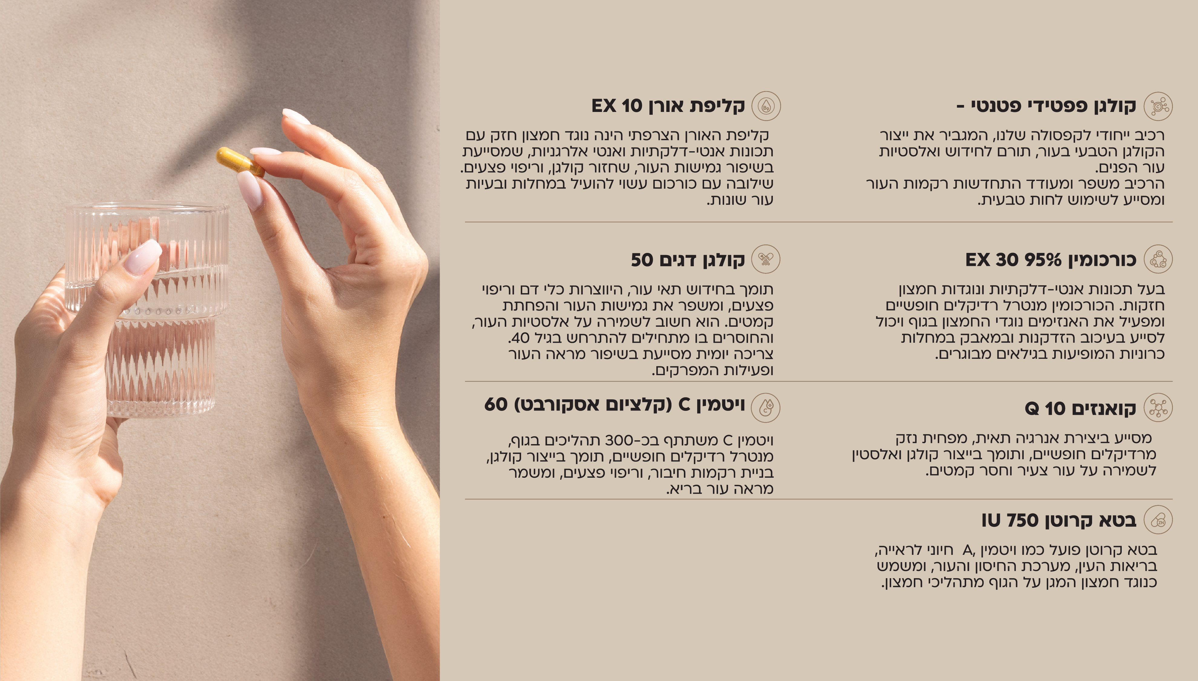 הפורמולה מורכבת משילוב מנצח של קולגן פפטידי פטנטי – הנספג במהירות בגופנו, מסייע בשימור הלחות ובשיפור האלסטיות לעור